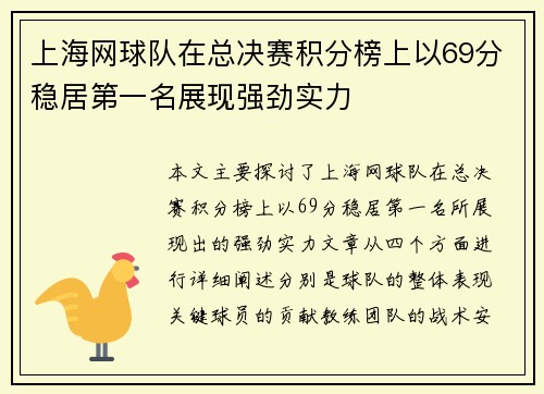 本文将对上海排球队的防反战术进行深入解析,重点讨论排球比赛中的攻防策略与团队协作。文章首先概述了排球比赛中攻防策略的重要性,特别是如何通过有效的防守和反击来取得比赛的胜利。随后,从四个方面详细探讨了上海排球队在实际比赛中所采用的具体战术,包括战术布置、队员配合、防守策略以及心理素质等。此外,文章还强调了团队协作在排球比赛中的关键作用,并通过实例说明如何通过良好的沟通与默契来提升整体表现。最后,对全...