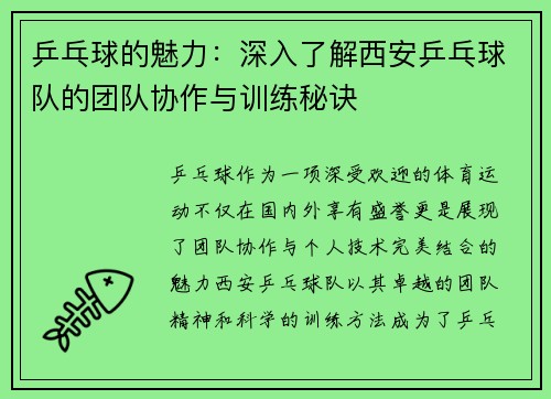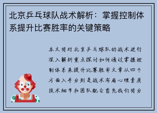 本篇文章旨在对广州乒乓球队的战术进行深入分析,并提出相应的提升策略。通过对球队现状、技术特点、战术运用和心理素质等方面的探讨,我们希望能够为球队未来的发展提供一些有益的建议。首先,本文将简要回顾广州乒乓球队的发展历程及其现有成绩,其次,将分析当前战术中的优势与不足,接着探讨如何通过针对性训练来提升球员的综合素质,最后,针对团队合作的重要性提出改进措施。整体而言,本研究希望能为广州乒乓球队在激烈竞争...